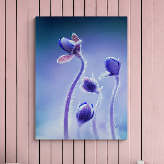 Dompel jezelf onder in de betovering van het voorjaar met ons schilderij Bloeiende Blauwe Bosbloemen. Dit kunstwerk verenigt het sublieme met het eenvoudige in een ingewikkelde expressie van natuurlijke schoonheid. De zachte kleuren en de fijne nuances van elke bloem en blad met de lichtblauwe achtergrond tonen pure elegantie.