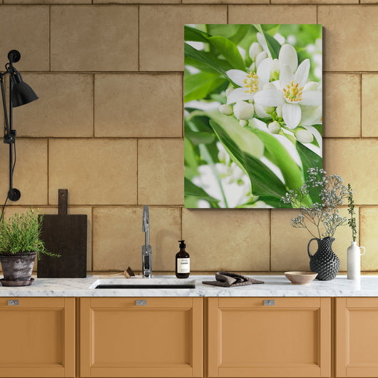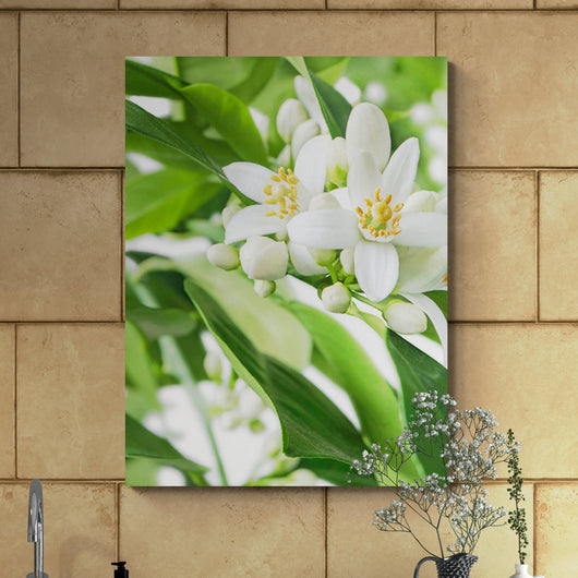 Ervaar de subtiliteit en gratie van de natuur met dit prachtige schilderij Citrusbloesems in volle Pracht, dat het beste van de sinaasappelboom toont - zijn bloemen, knoppen en levendige bladeren. De onberispelijke witte bloesems stralen een ongeëvenaarde elegantie uit, waardoor je je verloren voelt in hun schoonheid.