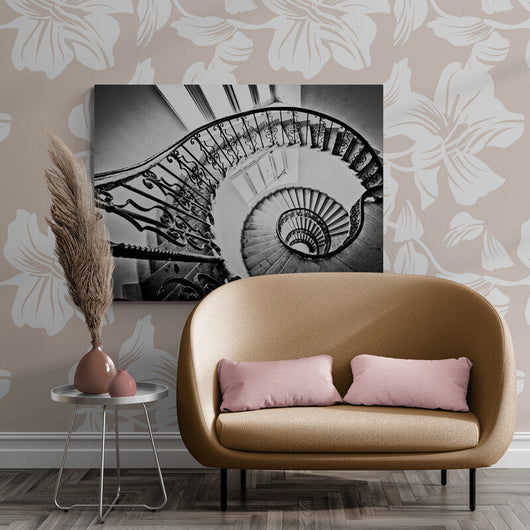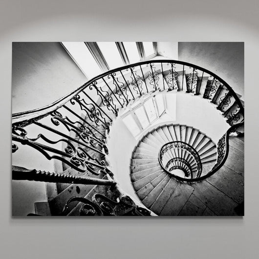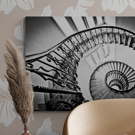 Laat de tijd stilstaan met dit betoverende schilderij, Dans van de Treden, dat de kunstzinnige grandeur van een klassieke wenteltrap vastlegt. Zie de delicate details van de sierlijke smeedijzeren leuningen en het hypnotiserende spiraalvormige ontwerp. De krachtige zwart-witcontrasten creëren een dynamische diepte en trekken de kijker mee in zijn eindeloze werveling.