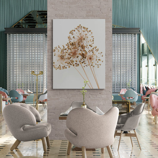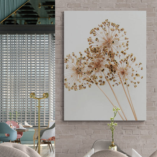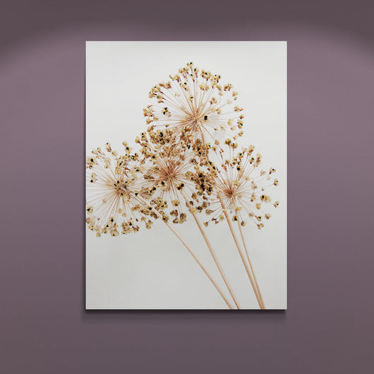 Breng een stukje eeuwige natuur in uw huis met het schilderij Droogbloemen. Dit zorgvuldig samengestelde kunstwerk laat de delicate structuur zien van droogbloemen, staand als stille getuigen van de tijd. Hun subtiele kleuren zijn gevangen in een dans van rustieke beige en bruintinten, die harmonieus contrasteren met de eenvoudige witte achtergrond.