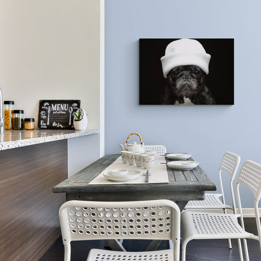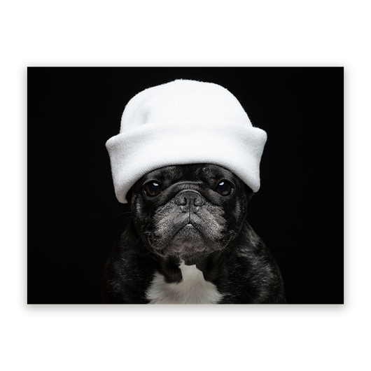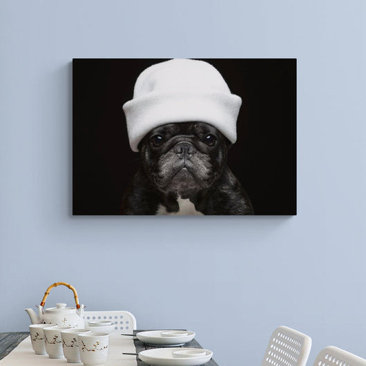 Het schilderij Elegante Bulldog is een onweerstaanbare combinatie van charme en finesse. Centraal staat een intrigerende Franse bulldog, uitgedost met een stijlvolle witte muts De levendige textuur van de muts contrasteert met de gladde vacht van de bulldog, terwijl de zwart-witte kleurstelling een klassieke elegantie uitstraalt.