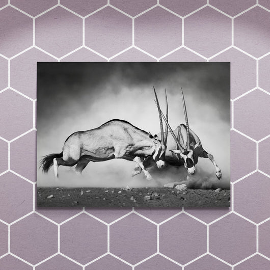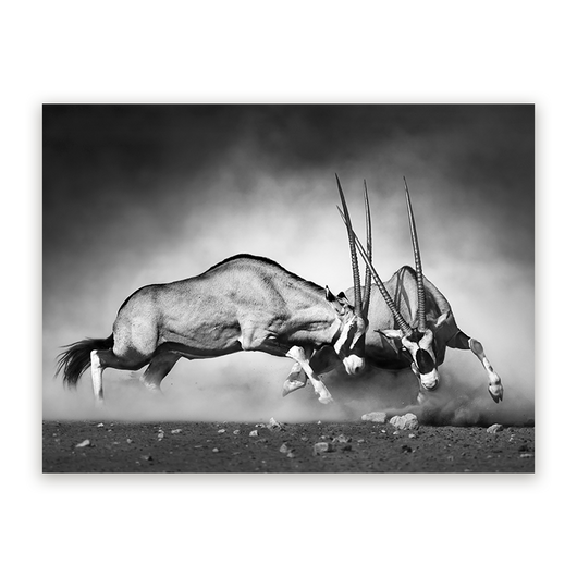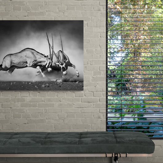 Ontketen de wilde geest van de Afrikaanse savanne met Gehoornde Rivalen. Dit schilderij toont een adembenemend tafereel van twee gemsbokken in een moment van conflict, een dynamische uitdrukking van de strijd om dominantie. De monochrome tinten benadrukken de visuele impact en leg de focus op de pure vorm en beweging van deze krachtige dieren.