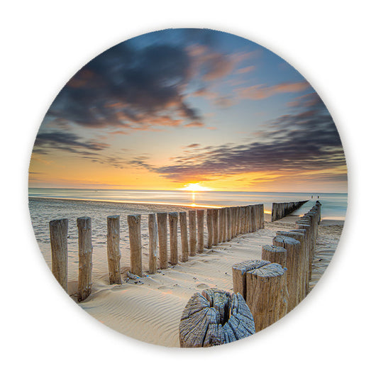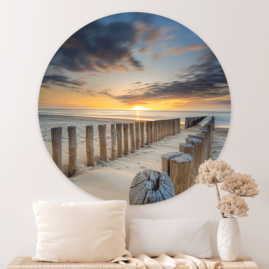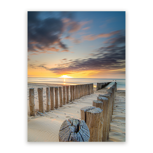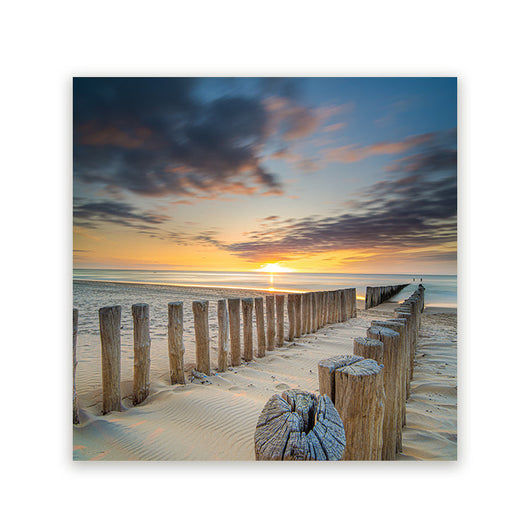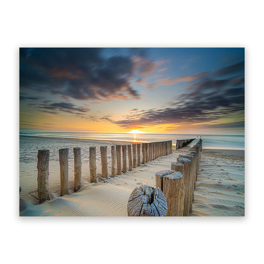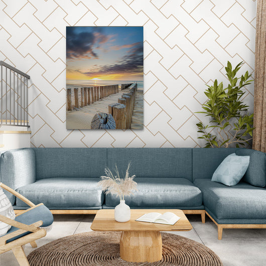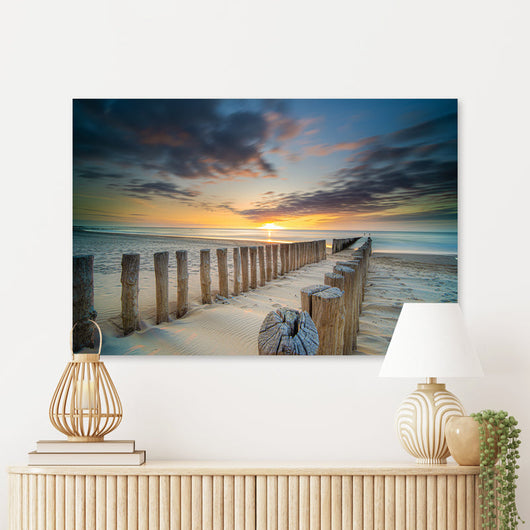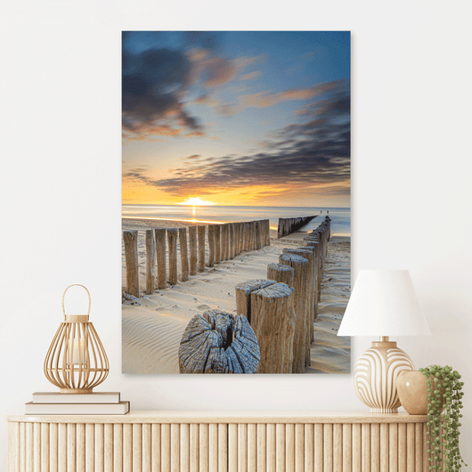 Ervaar de verbluffende wereld van Golfbrekers. Dit schilderij belichaamt de pure essentie van de kust bij zonsopgang, met levendige kleuren die de horizon sieren en oude, houten palen die stilletjes de verhalen van de zee vertellen. Elke detail brengt een gevoel van vrede en kalmte, waardoor dit kunstwerk meer is dan alleen een beeld – het is een ervaring.