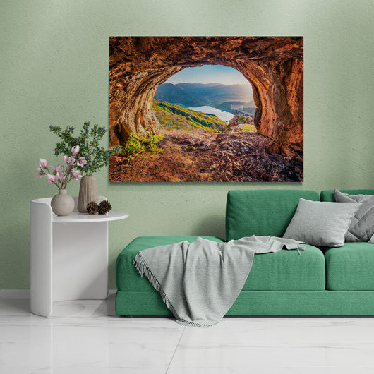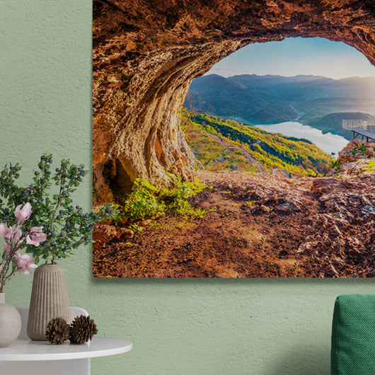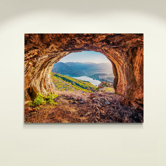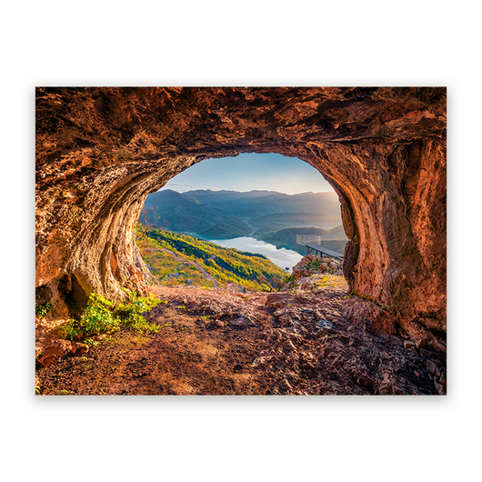 Verrijk je interieur met de serene pracht van het Bovilla Meer, gevangen vanuit het perspectief van een geheime grot. Dit schilderij, genaamd Grotuitzicht op Bovilla Meer, is een venster naar de ongerepte natuur van Albanië, rechtstreeks in jouw thuisomgeving.