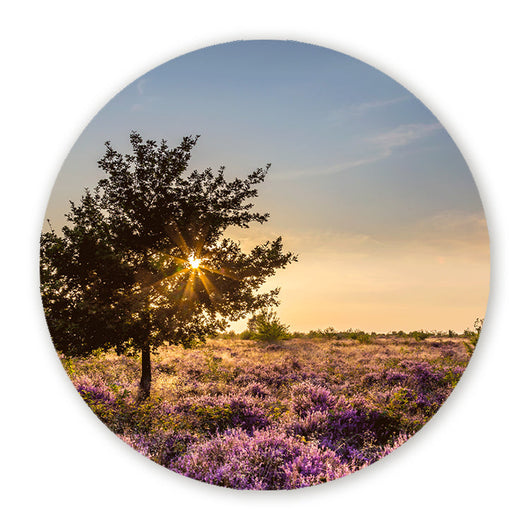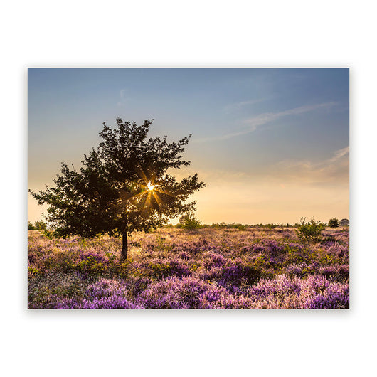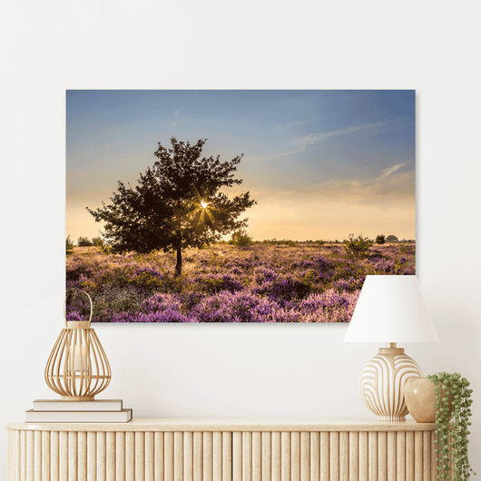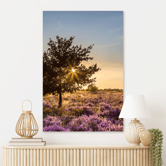 Breng de rust van de natuur in huis met dit prachtige schilderij van een heidelandschap bij zonsondergang. De levendige paarse tinten van de bloeiende heide en het warme licht van de ondergaande zon creëren een serene en sfeervolle uitstraling. Dit schilderij is verkrijgbaar in een liggend, staand en vierkant formaat, met haarscherpe details en hoogwaardige printkwaliteit. Een perfecte toevoeging aan elk interieur.
