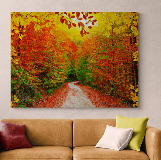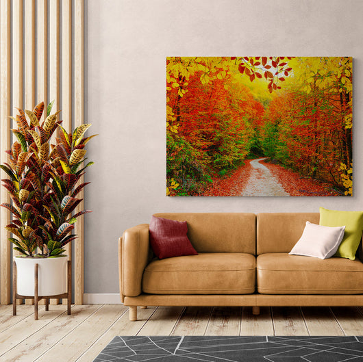Betreed een wereld van natuurlijke schoonheid met het schilderij Kleurrijke Herfstwandeling in het Bos. Het tafereel toont een voetpad dat je uitnodigt om het bos te verkennen, terwijl het kleurenpalet van oranje, geel en rood je zintuigen prikkelt.