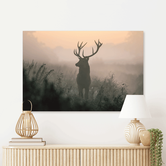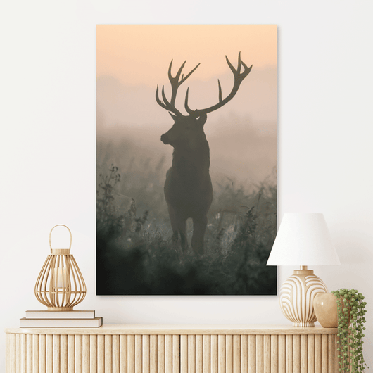 Breng de natuur in huis met ons Hert in de Ochtendmist schilderij. Het hert in deze creatie straalt een soort rustige waardigheid uit, versterkt door de mistige ochtendkleuren op de achtergrond.