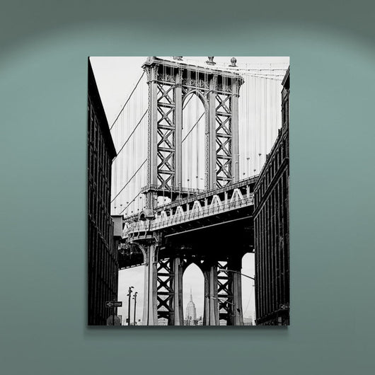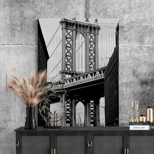 Verlies jezelf in de fascinerende structuren van New York met ons schilderij Manhattan Bridge. Dit diepe zwart-wit beeld legt de markante contouren van de Manhattan Bridge vast, gezien vanuit de voorkant van DUMBO in Brooklyn. Het rijke spel van licht en schaduw in dit kunstwerk onthult elk subtiel detail, en bijna een sfeer die zowel klassiek als modern is.