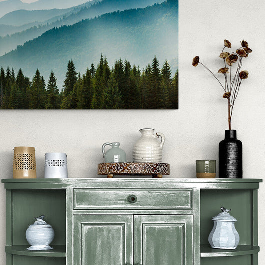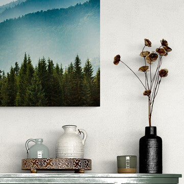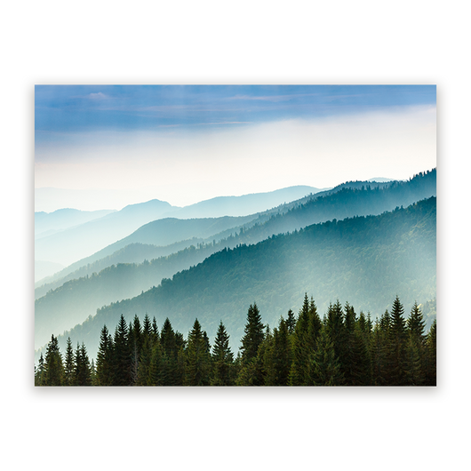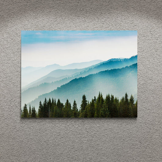 Laat je zintuigen ontwaken met het schilderij Bergen in Ochtendnevel. Dit kunstwerk toont de pracht van een zomerse ochtend, waarbij de mistige bergen zich zachtjes onthullen en zonnestralen zich een weg banen door de dennenbossen, wat zorgt voor een spel van licht en schaduw.