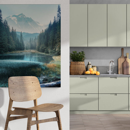 Dit schilderij verheft elke ruimte, door de natuurlijke schoonheid en de stilte van een zomerse dageraad in huis te halen. Hang Mistige Ochtendmagie op waar je de reflecterende kalmte en de schoonheid van een ontwakende wereld kunt bewonderen. Het nodigt uit om even te pauzeren en te genieten van de eenvoudige pracht van de natuur die zich uitstrekt verder dan het canvas.