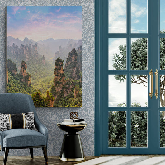 Laat je interieur spreken met de tijdloze allure van de Chinese natuur door Mystiek Zhangjiajie als schilderij aan je collectie toe te voegen. Dit kunststuk brengt de adembenemende schoonheid van het Zhangjiajie National Forest Park tot leven, met zijn nevelige pieken die hoog in de hemel prikken als monumenten van natuurlijke pracht.