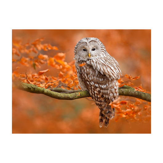 De achtergrond is gevuld met de levendige kleuren van herfstbladeren, waardoor het beeld een diep gevoel van rust uitstraalt. Het is een ode aan de stilte en subtiliteit van de natuur en het voegt sfeer toe aan elk interieur.