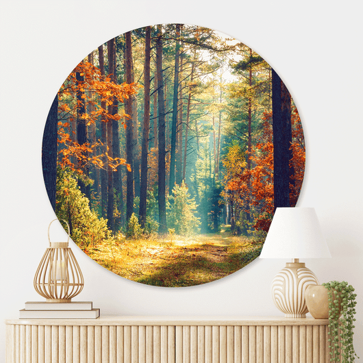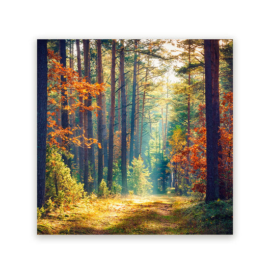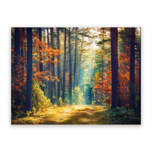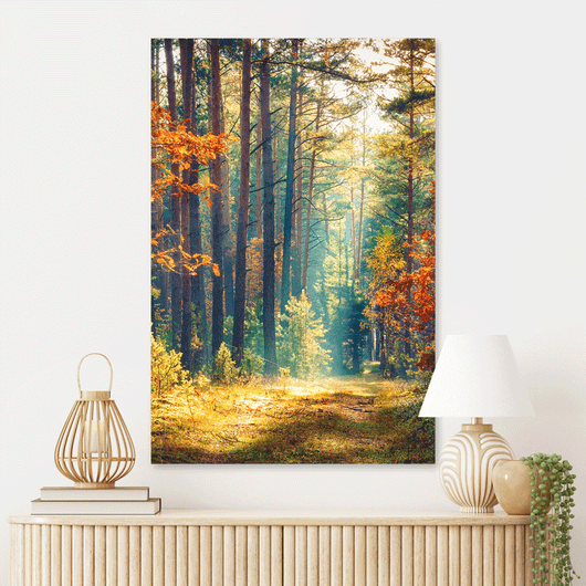 Als een venster naar een andere wereld, nodigt het schilderij Herfstbos bij Ochtendgloren je uit om de magie van de natuur van dichtbij te beleven. De kleuren zijn zo levendig en de zonnestralen zo goed gevangen, dat je bijna de frisse herfstlucht kunt inademen.