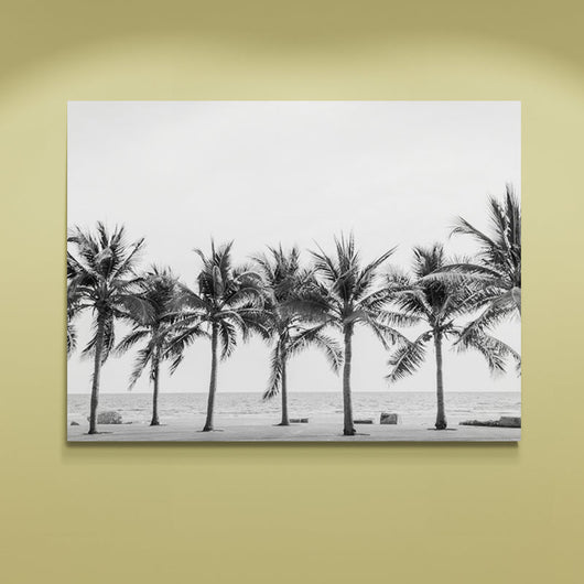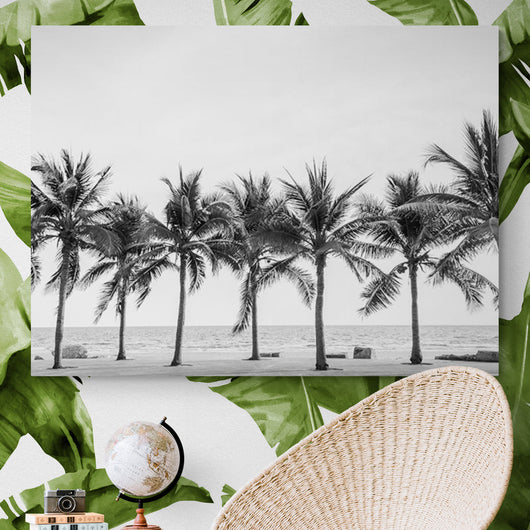Dompel jezelf onder in de serene schoonheid van de kust met het Palmen aan de Kust schilderij. Elk detail van de statige palmbomen is prachtig vastgelegd in dit zwart-wit meesterwerk, waardoor je het gevoel dat hebt je er bij bent.