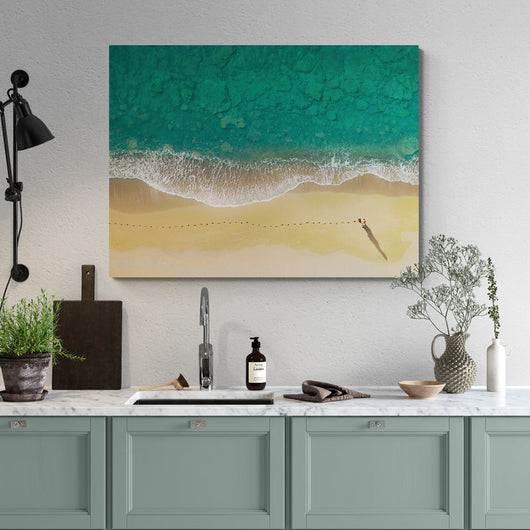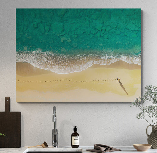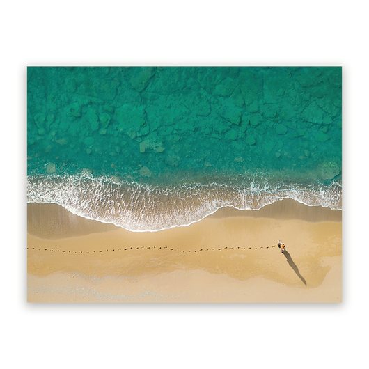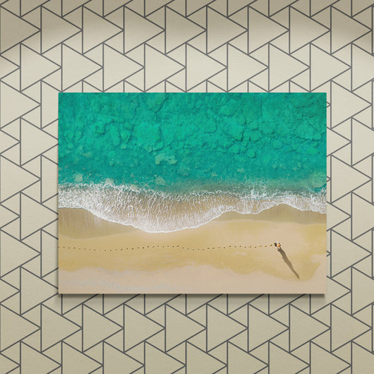 Ontsnap aan de alledaagse drukte met ons Perfect Paradijs. Deze foto, genomen vanuit een zeldzaam vogelperspectief, toont de grandeur van een onstuimige zee en de rust van helderblauwe wateren De zachte aanraking van de golven op het gouden strand, gecombineerd met een eenzame wandelaar, staat symbool voor vrede en zelfreflectie.