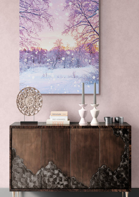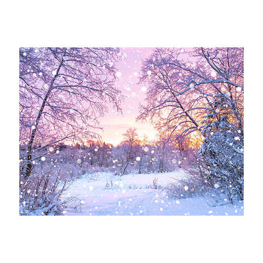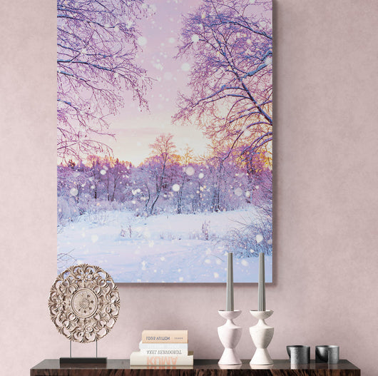Ervaar de betovering met ons schilderij Prachtige Winterochtend. Het beeldt de delicate momenten van een winterochtend uit, waarbij de nacht plaatsmaakt voor de dag. De takken en de grond zijn bedekt met een sneeuwlaag, terwijl de eerste stralen van de zonsopgang alles in een paarse gloed zetten.