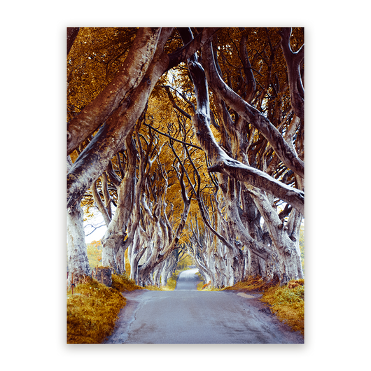 Sta versteld van de diepe schoonheid van Noord-Ierland met ons schilderij van The Dark Hedges. Deze afbeelding legt de essentie van deze beroemde beukenlaan vast, waar de bomen in een eeuwenoude dans lijken te verstrengelen en een pad vormen dat doordrenkt is van legendes en verhalen.