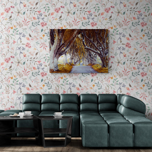 De rijke kleuren van het schilderij voegen een atmosferische diepte toe aan je ruimte, waardoor je het gevoel krijgt dat je door de kronkelende laan van County Antrim wandelt. Het licht dat speels door het dichte bladerdak breekt, voegt een vleugje magie toe aan het geheel.