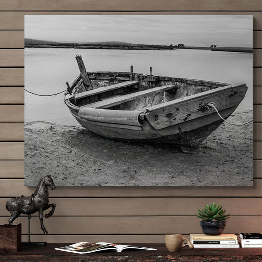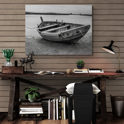 Betover je ruimte met het Vergeten Aanlegplaats schilderij. De afbeelding van een verlaten boot aan de kalme waterkant brengt een gevoel van rust en reflectie. De grijstinten in combinatie met de natuurlijke omgeving creëren een sfeer van stille bezinning. Dit kunstwerk is niet alleen een esthetische aanvulling op je interieur, maar ook een symbool van tijdloze schoonheid en de verhalen die de natuur vertelt ons.