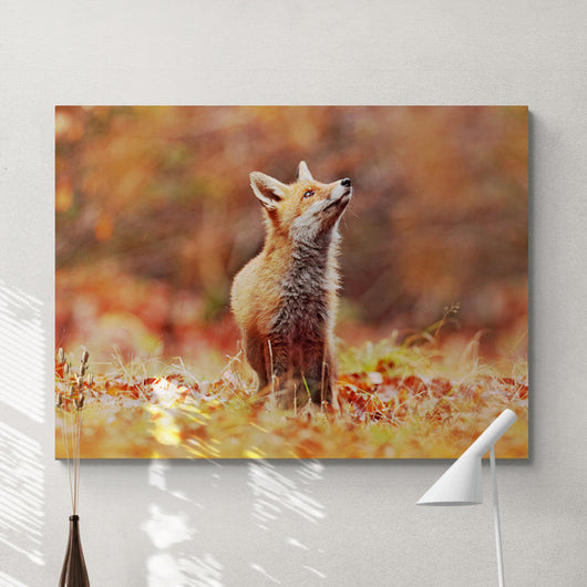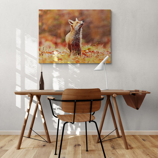 Omarm de charme van het bos met Vos in Herfstlandschap, een schilderij dat een jonge vos in de volle pracht van de herfst vastlegt. De vos, met een blik gericht naar de hemel, staat symbool voor nieuwsgierigheid en de vrijheid van de natuur, zijn vurige vacht een levendig contrast tegen de rijke, aardse tonen van de herfstbladeren.