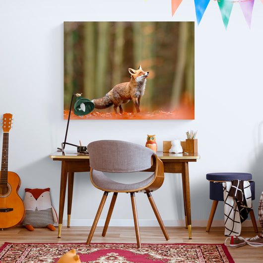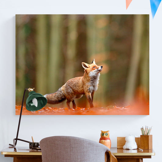 Treed binnen in een wereld van natuurlijke gratie met ons schilderij Vos in het Woud. De vos, een iconisch dier in de Europese folklore, wordt in dit kunstwerk gevangen in zijn natuurlijke habitat, omgeven door de warme tinten van herfstbladeren.