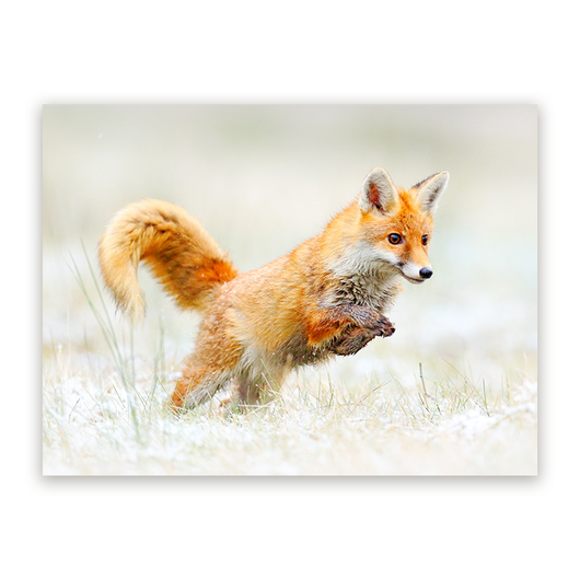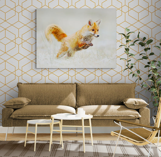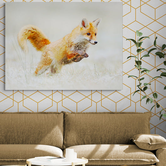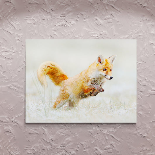 Ervaar de harmonie van natuur en stijl met ons Vos in Winterwonderland schilderij. Centraal staat een majestueuze vos, gevangen in een gracieuze sprong, omgeven door de eerste sneeuw van het seizoen. Elk detail, van de glanzende oranje tinten van zijn vacht tot de sprankelende sneeuw, is met perfectie vastgelegd.