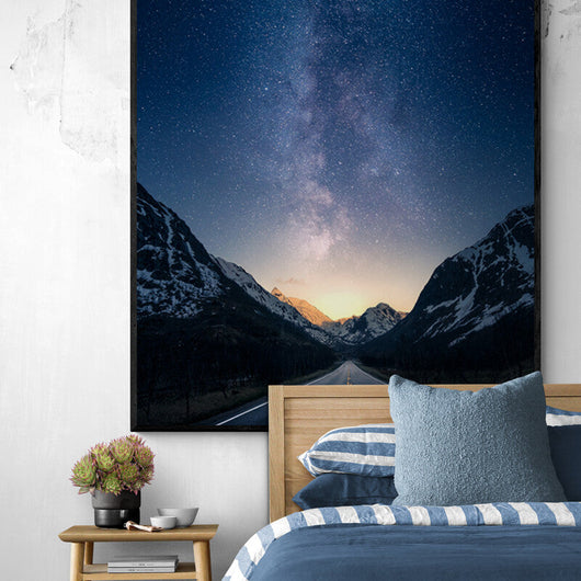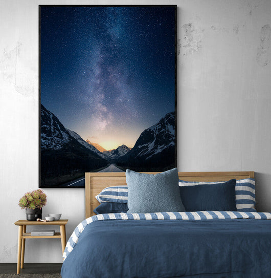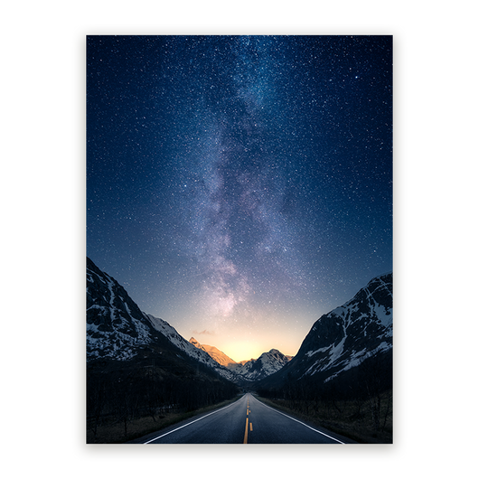 Ons Weg naar Sterrenhemel schilderij brengt de grandeur van een nachtelijke hemelreis in een klassieke rechthoekige vorm, die zowel de grootsheid als de intimiteit van een stille nacht onder de sterren vastlegt. Dit kunstwerk vormt de perfecte fusie tussen natuur en nacht, een herinnering aan de stille momenten die we onder de sterren doorbrengen, wanneer we onze diepste gedachten en dromen de vrije loop laten.