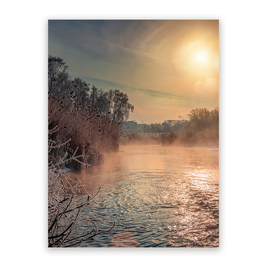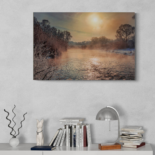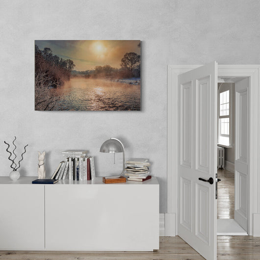 Ervaar dagelijks de betovering van de Winterse Ochtendglans met dit prachtige schilderij. Het beeldt een winterlandschap uit waar de zachte ochtendgloed zich vermengt met de nevel boven de rivier. Het geeft een gevoel van ontspanning en rust.