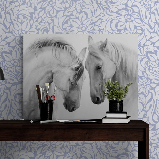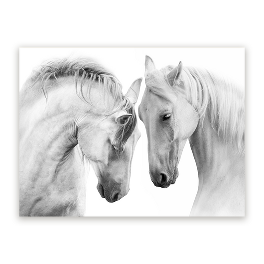 Dit prachtige canvas is een ode aan de natuurlijke pracht en de ongesproken taal tussen dieren. Elk aspect, van de dynamische compositie tot de fijne textuur, wordt zorgvuldig uitgevoerd om een kunstwerk van ongekende diepte en schoonheid te creëren. Het is een essentiële aanvulling voor elke liefhebber van paarden en een eyecatcher in elke ruimte.