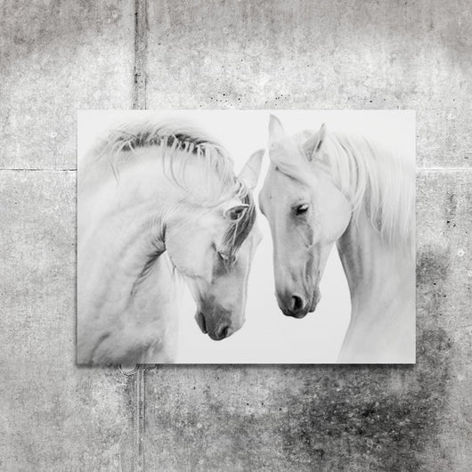Het schilderij Witte Paarden nodig uit om de stille wereld van deze magnifieke dieren te optreden. De subtiele nuances van zwart, wit en grijs tonen elke haar en elke fluistering van beweging, waardoor dit meer dan een schilderij is; het is een poëtische ervaring. De witte paarden, weergegeven in een intieme setting, lijken elkaar te kennen tot in de ziel, een beeld van kalme kracht en onderlinge verschillen.