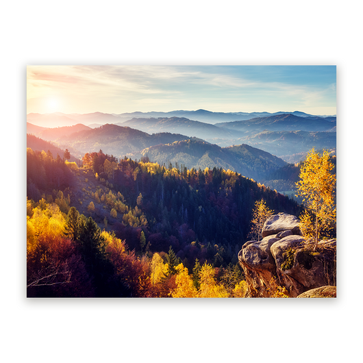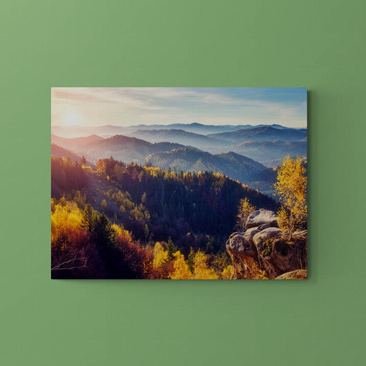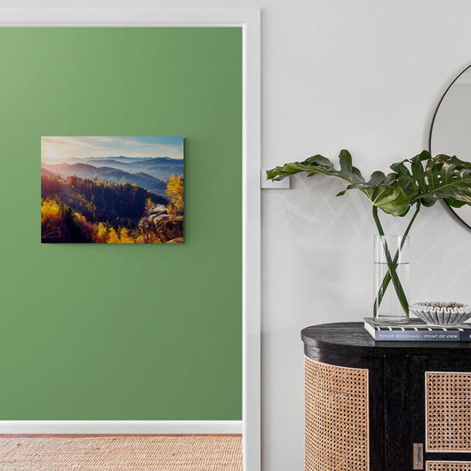 Beleef de betovering van Zonovergoten Vallei telkens weer met dit schilderij. Kijk hoe de zonnestralen zich een weg banen door de bomen en de vallei in een gouden gloed zetten, waardoor elk detail schitterend wordt geaccentueerd.