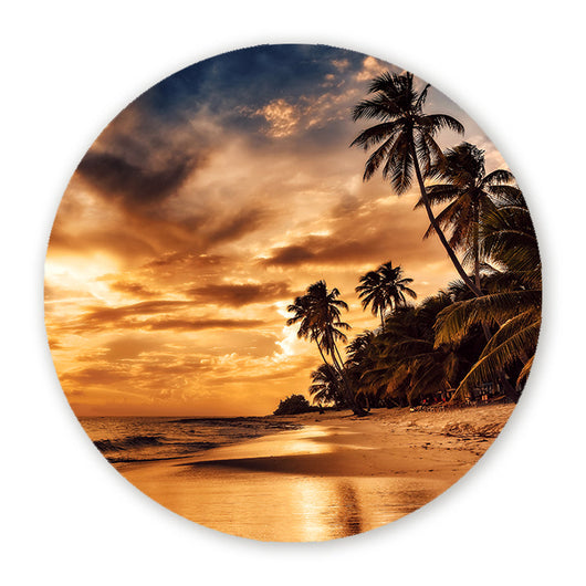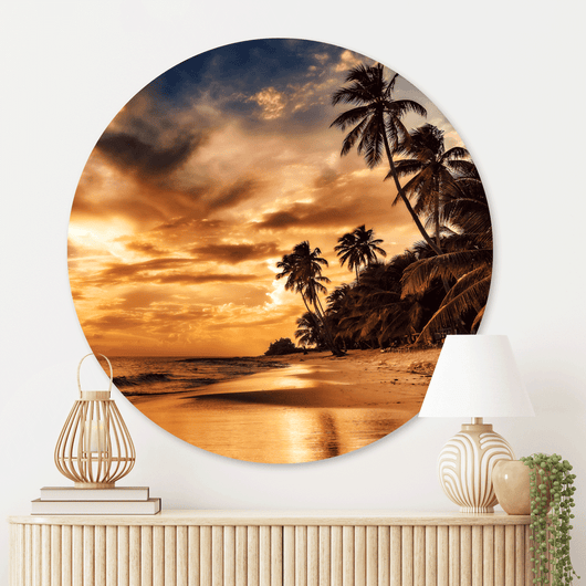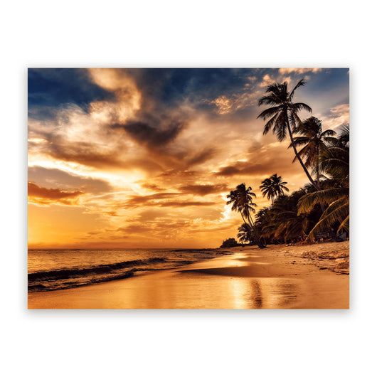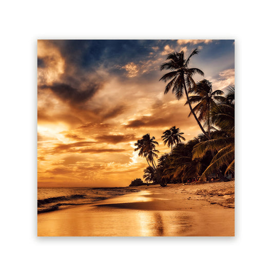 Het Zonsondergang op het Strand schilderij is een kunstwerk dat de essentie van de natuur vastlegt. De warme kleuren van de lucht vloeien samen met het kalme strand, terwijl de palmbomen een gevoel van rust creëren.